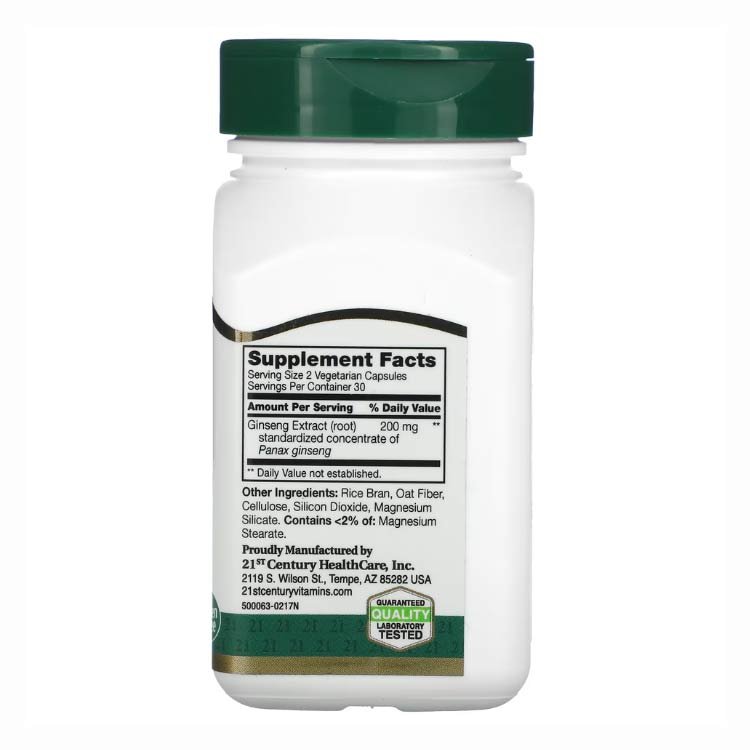 کپسول استاندارد جینسینگ   21st Century یک مکمل گیاهی انرژی‌زا و تقویت‌کننده طبیعی سلامت جسمی و ذهنی است که از استخراج استاندارد شده ریشه جینسینگ پاناکس (Panax Ginseng) تهیه شده و به‌عنوان یک مکمل سنتی برای افزایش انرژی، پشتیبانی از بدن در برابر استرس و بهبود کیفیت زندگی شناخته می‌شود. این کپسول‌ها در قالب گیاهی عرضه می‌شوند و فاقد گلوتن، قند، مواد نگهدارنده و طعم‌دهنده‌های مصنوعی هستند، بنابراین انتخابی طبیعی برای استفاده روزمره می‌باشند.