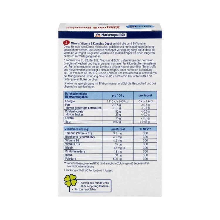 مکمل ویتامین B کمپلکس یک فرم جامع از تمام ویتامین‌های گروه B است که شامل B1، B2، B3، B5، B6، B7 (بیوتین)، B9 (فولات) و B12 می‌باشد. این گروه ویتامین‌های ضروری در بدن نقش‌های مهمی در تولید انرژی، متابولیسم غذا، سلامت عصبی، عملکرد مغز و سیستم ایمنی دارند و به‌طور طبیعی در بسیاری از غذاها یافت می‌شوند.