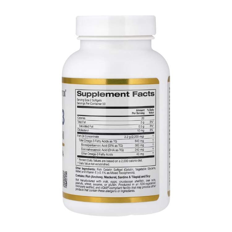 کپسول امگا-۳ پریمیوم روغن ماهی ۱۰۰ عددی – California Gold Nutrition Omega-3 Premium Fish Oil یک مکمل امگا-۳ با کیفیت بالا و جذب آسان است که به پشتیبانی از سلامت قلب، مغز، بینایی، سیستم ایمنی و کاهش التهاب بدن کمک میکند. این محصول مناسب بزرگسالانی است که میخواهند سطح امگا-۳ بدن خود را بهصورت موثر و روزانه افزایش دهند.